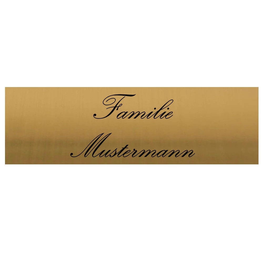 Bei der hochwertigen Lasergravur entsteht eine schwarze Gravurfarbe, die sich deutlich vom goldfarbenen Hintergrund abhebt. Dadurch ist Ihr Familienname auch aus größerer Entfernung klar erkennbar. Diese Technik sorgt für präzise, saubere Konturen und eine glatte Oberfläche ohne Vertiefungen – pflegeleicht und langlebig zugleich.